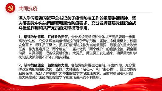 会议伊始,主持人胡星妮同志介绍支部基本情况和支部人员架构,并简述了支部工作计划和主要任务,公布了支部成员考核标准。紧接着,由新任支委做自我介绍,她们对支部的建设提出了自己的想法,表示未来会不负信任、勇担责任。此后,主持人带领深入学习习近平总书记关于疫情防控工作的重要讲话精神,她强调道:“当前疫情防控形势严峻,我们要带头遵守防控政策,也要为其他人做好服务保障,有事情冲在最前面。”支部成员纷纷表示,不论身处哪里,一定会积极作为,主动担当。