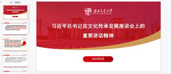 随后,邢芳菲和朱广赢两位同志领学“习近平总书记在文化传承发展座谈会上的重要讲话精神”。邢芳菲同志结合自身专业,阐述中华文明具有的五个突出特性,指出要坚定文化自信,为推动文化繁荣、建设文化强国贡献力量。朱广赢同志重点阐述了坚持把马克思主义基本原理同中国具体实际相结合、同中华优秀传统文化相结合的深刻内涵和重大意义,强调要在新的历史起点上增强历史主动,研究中华文明发展规律,总结中华优秀传统文化内涵特色。