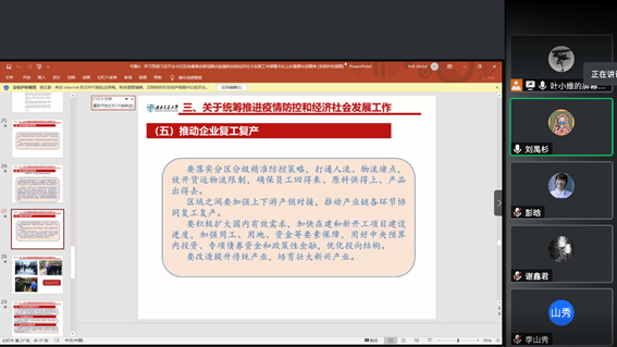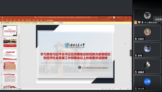 本次主题党日活动可以分为两个阶段,第一阶段为支部书记讲授专题党课,主要从1月至今的疫情防控工作之不同重点、统筹推进疫情防控和经济社会发展工作、加强党对统筹推进疫情防控和经济社会发展工作的领导以及学校在线直播有序推进学校复学复课工作等几个方面。支部书记叶小维在讲到疫情防控工作时提到,我们当前的重点已经从严格疫情防控各项措施转向了如何在疫情防控常态化条件下加快恢复生产生活秩序,现在我国已经有了较为系统的疫情防控措施,内防反弹,外防输入。