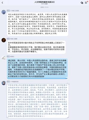过后,支部党员们紧密围绕“习近平总书记在纪念中国人民志愿军抗美援朝出国作战70周年大会上重要讲话”在线上展开讨论。