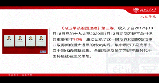 第二部分由刘丹同志带领大家学习《习近平谈治国理政》第三卷,《习近平谈治国理政》第三卷生动记录了自2017年10月18日至2020年1月13日期间党和国家各项事业取得新的重大进展的伟大实践,集中展示了马克思主义中国化的最新成果。刘丹同志通过介绍第三卷编辑体例及逻辑结构创新、思想和方法、重要意义,使大家对于习近平新时代中国特色社会主义思想有了深入的认识,对于贯穿其中的马克思主义立场观点方法有了进一步的把握。楚莹莹同志根据第三卷内容,结合自己的家乡发展,为大家分享了脱贫攻坚方面取得的成就,使大家更加深刻认识到了脱贫攻坚体现了我们党以人民为中心的根本立场。