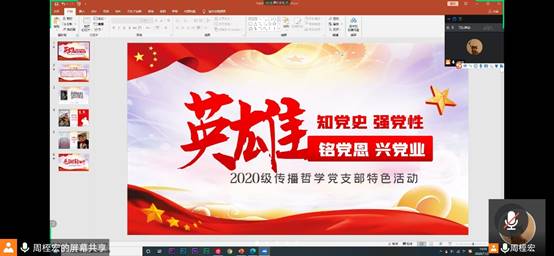 在线直播统一指导下,2020级传播哲学党支部开展了“知党史 强党性 铭党恩 兴党业”校级示范性党支部活动。
